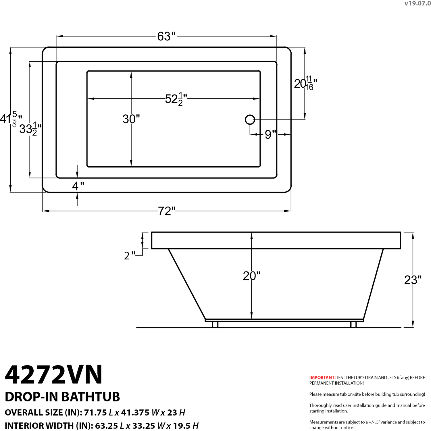 Venetian series bathtubs resemble simplicity set in classic design. A rectangular, minimalism-inspired design turns simplicity of square forms into perfection of symmetry. Creates an elegant, functional centerpiece for your bathroom and the focal point for relaxation. Aesthetically appealing and physically soothing merging both worlds into a triumph of elegance.Give us a call at 1-866-588-8008 if you have any questions or just need help selecting the right tub for your needsSOAKING BATHTUB - Non-jetted deep soaking bathtub that’s easy to install. No need to run electrical wiring.Marine grade acrylic with fiberglass reinforcement offers a smooth long lasting shine with superior durabilitySmooth, glossy ultra white acrylic finishReversible drain locationOverall dimensions: 71.75" L x 41.375" W x 23" HBasin dimensions: 63.25" L x 33.25" WAverage water capacity: 75 gallons10 YEAR WARRANTY - Bathtub shell is protected with a limited 10 year warranty against manufacturer defects; 1 year for parts replacement; 90 days for laborCurbside delivery only. The carrier will only unload the bathtub off the truck and is not responsible for carrying package inside home.IAPMO Listed10 year warranty on bathtub shell; 1 year warranty on parts; Lifetime warranty on door seal
