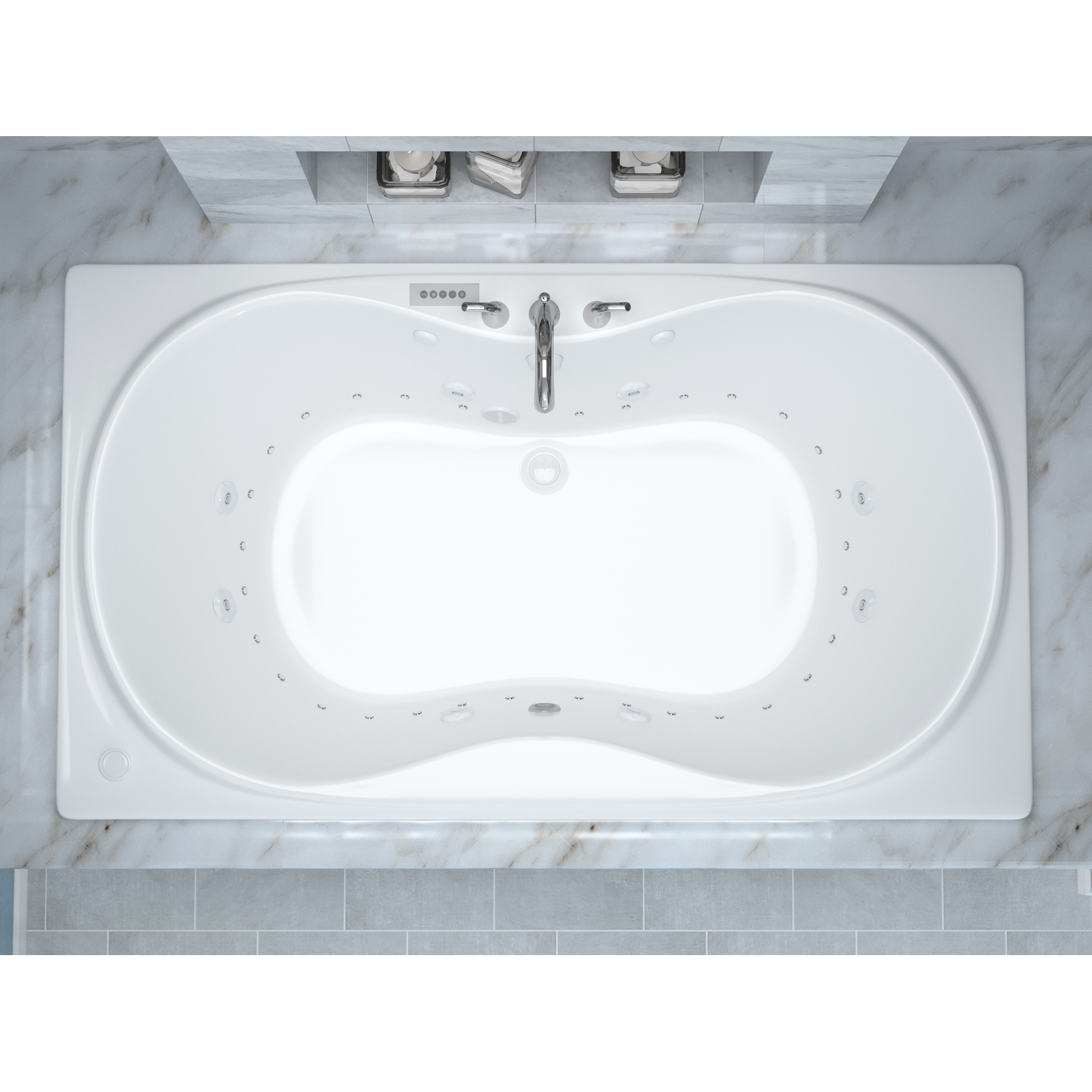Whisper rectangular bathtubs are equipped with an oval opening. Two round cockpits are placed on either side, providing extra back and arm room. Creates an elegant, functional centerpiece for your bathroom and the focal point for relaxation. Aesthetically appealing and physically soothing merging both worlds into a triumph of elegance.WHIRLPOOL JETTED - 8 adjustable & directional hydro-therapeutic whirlpool massage jetsAIR JETTED - 27 Acu-Stream air jets for a soothing total body aero-therapeutic massageAROMATHERAPY - Experience the deeply soothing sensation of enveloping yourself in the rich fragrance of Universal Tubs' aroma infused massage bubbles.CHROMATHERAPY - Reinvigorate your mind as well as your body by basking in the soothing radiance of Chromatherapy colored light bathingMAINTENANCE HEATER - Maintains warm and comfortable bathing temperatureO3 OZONATOR - The installed Ozonator system maintains clean plumbing for a healthy and sanitary whirlpool experienceTOUCH PAD CONTROLS - Complete control of jetted and lighting functions for a stylish control console.Marine grade acrylic with fiberglass reinforcement offers a smooth long lasting shine with superior durabilitySmooth, glossy ultra white acrylic finish with matching trimOverall dimensions: 71.75" L x 41.5" W x 23" HBasin dimensions: 60.75" L x 29.25" WAverage water capacity: 65 gallonsCenter drain with right side pump locationIAPMO Listed