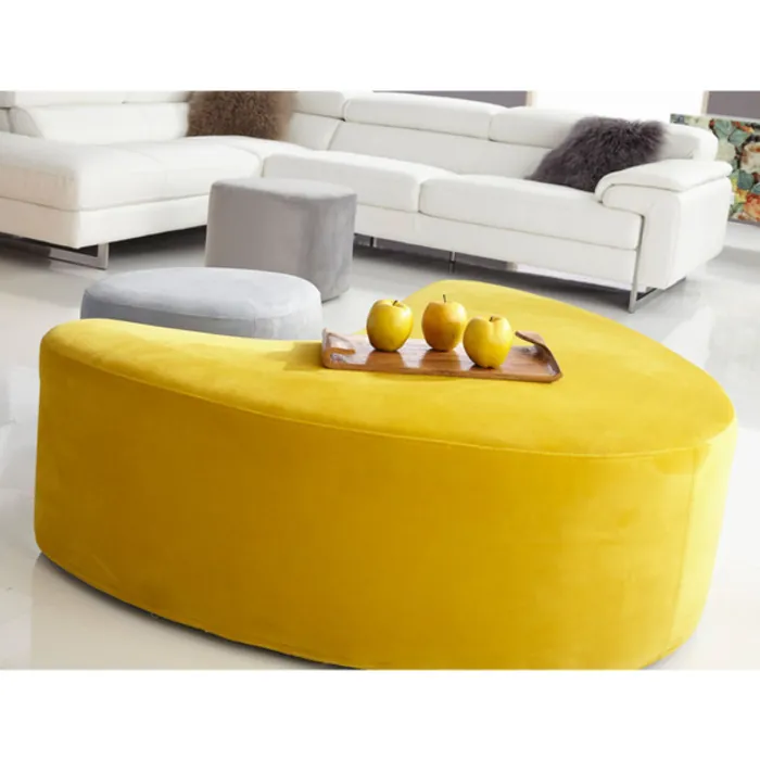 - Ottoman in Lune shape covered with soft Microfiber Yellow fabric upholstery, also available in matching small Cylinder shape. Dimensions: L 46'' x W 39'' x H 16''