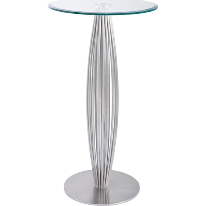 The Linda bar table has a tempered glass top and brushed round stainless steel posts and base