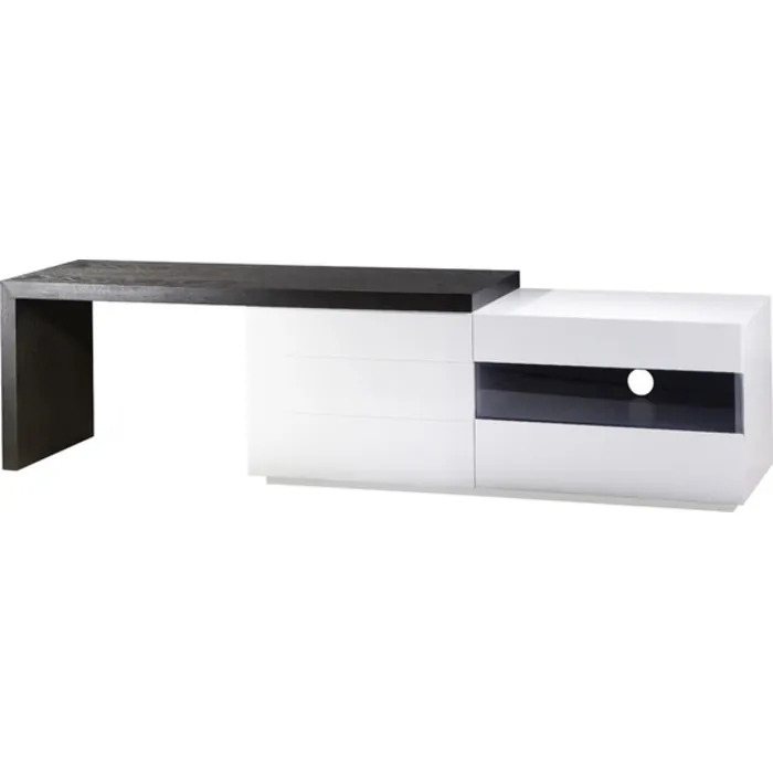 Recommended TV Type: Flat ScreenProduct Type: TV standDesign: Enclosed storageFinish: White gloss lacquer with black ash accent extensionGloss Finish: YesNumber of Items Included: 1Style: ModernExterior Shelves: YesDrawers Included: Yes