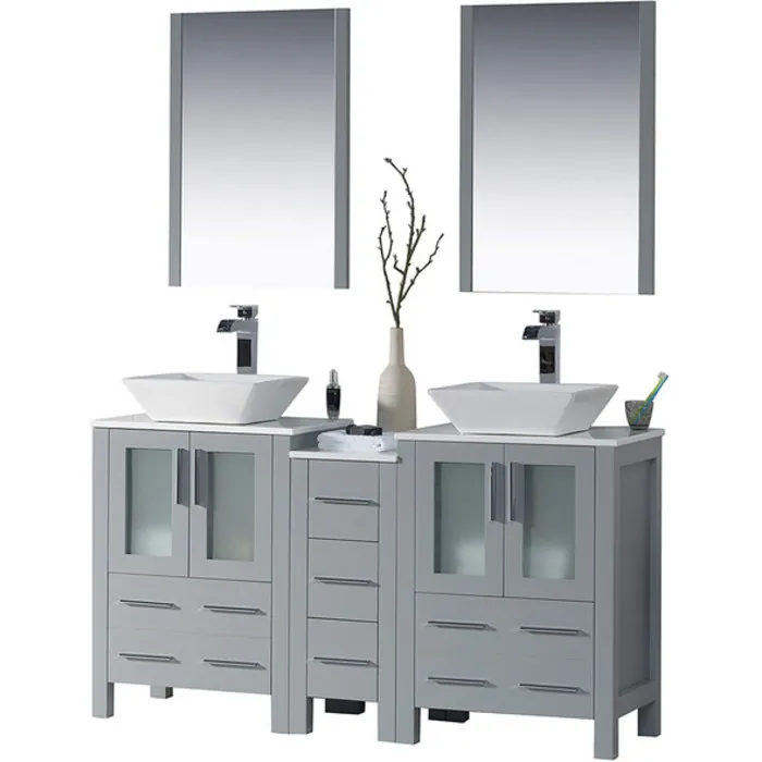Blossom 60 Inch Bathroom Vanity with Ceramic Double Vessel Sinks & Mirrors - Metal Gray 001 60S1 15 V M
