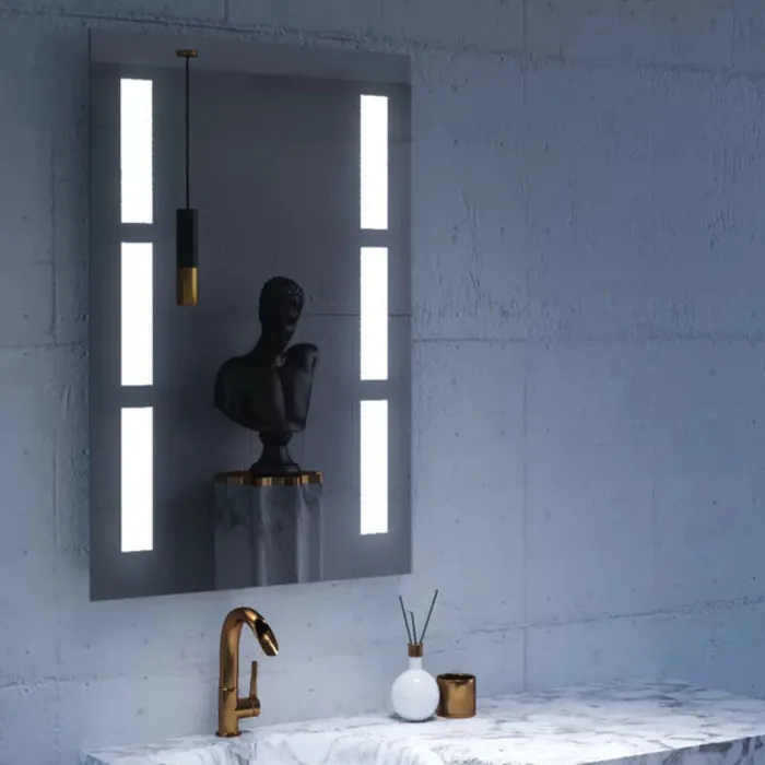 - Easy hanging system featuring an invisible rubber trim for waterproof design. Rectangle mirror shape to hang vertically. 5mm polished edge glass mirror. 50,000 hour LED bulbs. 5,000K color temperature light. UL listed Driver . Requires electrical hardwire installation.