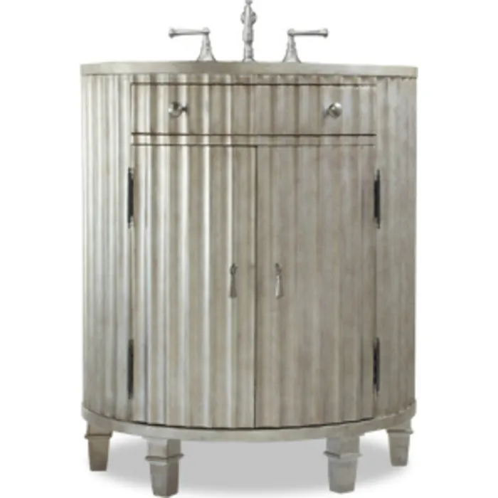 Fluting detail and a concave demilune shape distinguish the Kinkaid that features two doors and an adjustable shelf inside. The drawer is non-operational to accommodate plumbing. Constructed of hardwood solids and veneers. Hardware is brushed nickel.