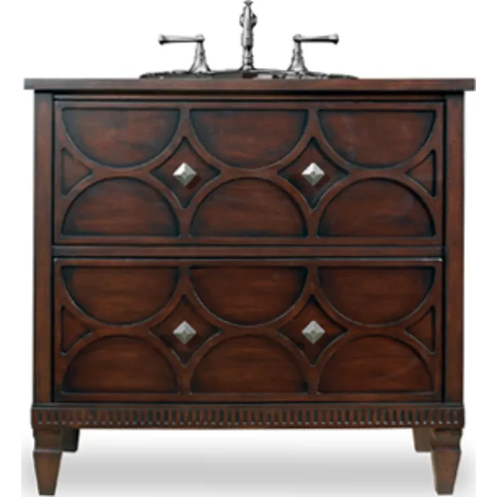 The Dalton Sink Chest is a handsome piece with unique carving details on the two drawer fronts and a dentil-style moulding at the base. Hardwood solids and cherry veneers are finished in a medium espresso. Hardware is a brushed nickel finish.