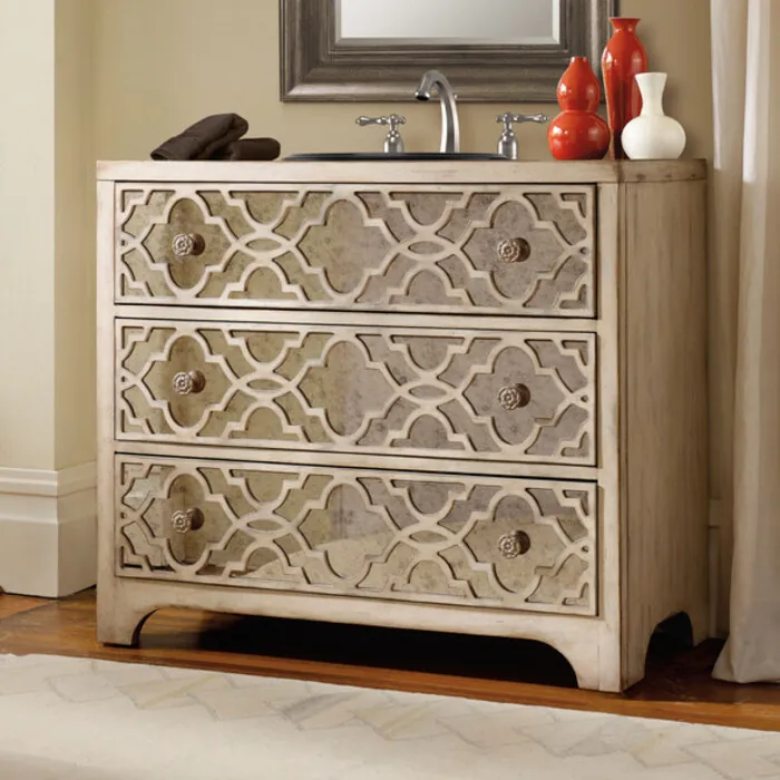 Transition easily from California villa to Chicago loft to Carolina cottage as the Grace Hall Chest exudes tranquility and charm with its updated transitional design perfect for any home or style. A pearlized Parchment finish adds updated but timeless beauty. Featuring two functioning antiqued mirror drawers with English dovetail construction and delicately designed pewter hardware. Handmade individually from Asian hardwood solids with select oak and red cedar veneers. Cole + Co. Carlylse or Coventry Drop-in sinks for use with existing wooden top; Cole + Co. Fairfield undermount should you want to add your own granite, marble or quartz top. Check meassurements to insure a fit prior to ordering. If stone top is preferred, please note on order "Cut for Granite" and Cole + Company craftsmen will cut a large hole in the top of the vanity prior to shipment to ease in sink positioning during customer-supplied stone top installation. Any and all vanities with custom cuts (including for a specified sink or stone top) are considered a special order and therefore are non-returnable. Cole will also cut to your own custom sink presuming it fits. Just note on the order which sink you will be using. If Cole + Company do not have a template for your particular sink, to insure a proper fit, Cole + Company may require you to send the sink or a template. All sink options subject to existing conditions on the vanity and are subject to change.Wooden vanity top as shown, to be cut by Cole for drop-in sink as specified by customer or cut out for addition of customer supplied custom stone top. Faucet holes standard is for widespread if sink is ordered otherwise, no cuts on top will be made.