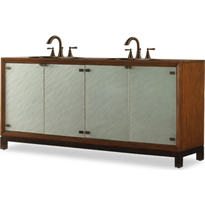 The Isla Sink Chest will have you dreaming of your favorite island destination. A gentle wave pattern runs through the four etched sea glass doors, which can be lighted at night for a moonlit glow. Sleek hickory veneers and select hardwoods in a sienna finish let the glass doors shine. Inside features two adjustable glass shelves and two felt-lined drawers. Hardware is finished in antique bronze.