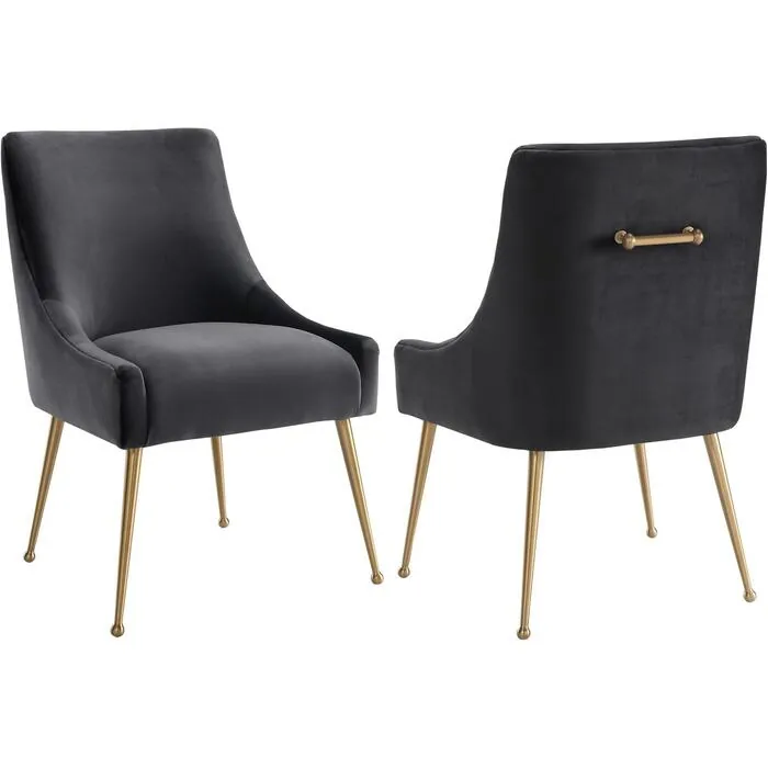 Sit pretty in this sumptuous yet durable velvet chair. The Beatrix dazzles as a dining chair or as an accent piece. Available in several colors with fab gold stainless steel legs and a matching handle on the back. Prop it into any room for a luxe, glamour effect.