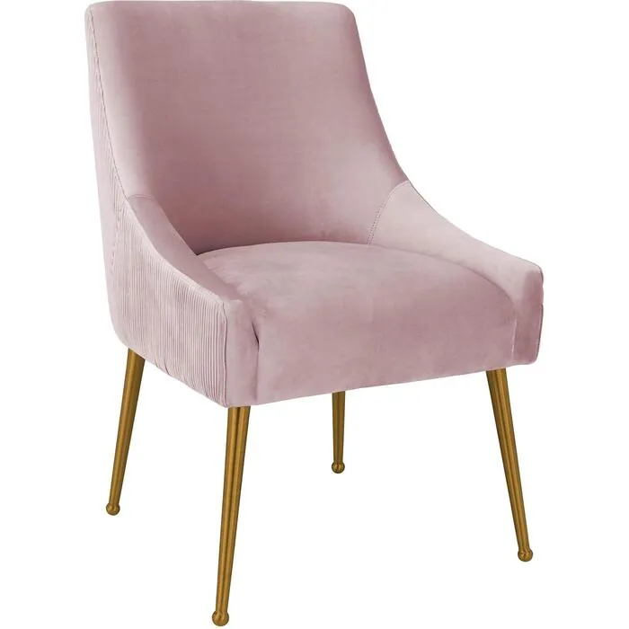 Sit pretty in this sumptuous yet durable velvet chair. The Beatrix dazzles as a dining chair or as an accent piece. Available in several colors with fab gold stainless steel legs and a matching handle on the back. Prop it into any room for a luxe, glamour effect.