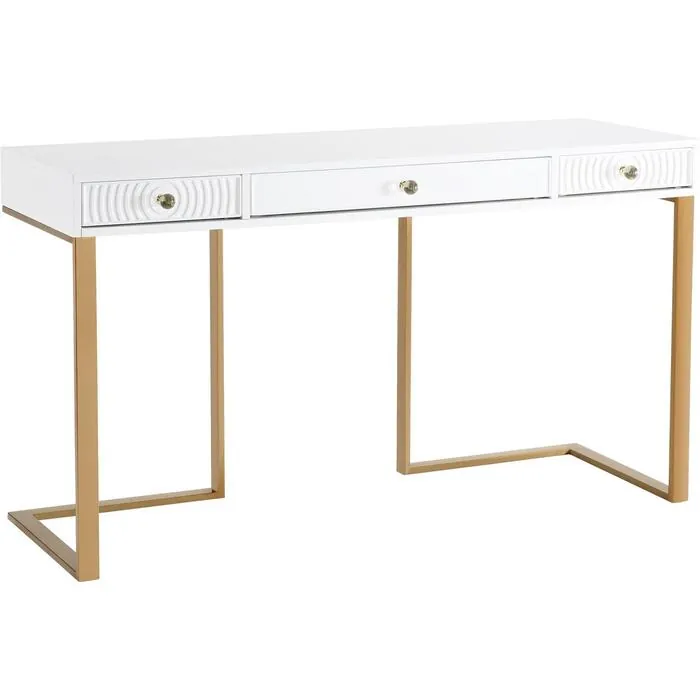 The Janie desk is fashion for your office. With three convenient drawers, staying organized is super simple. Featuring a lacquered wooden top, clear acrylic handles and a geometric gold base your workspace will be as trendy as you are.