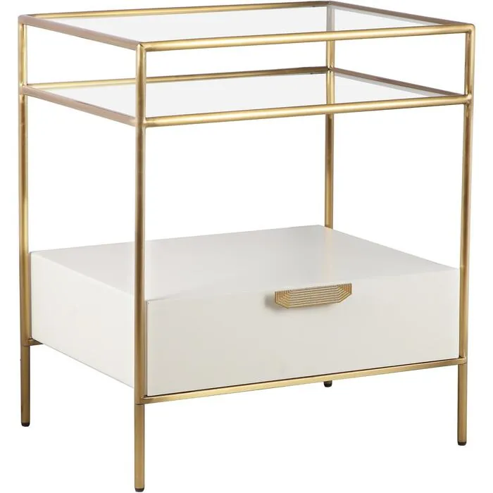 Add some understated drama to your bedroom with the Darla Cream Glass Nightstand, designed for effortless assembly without compromising on style. Its beautiful silhouette is accentuated by a brushed brass frame that glistens subtly beside any bed. With a glass top and shelf, along with a statement drawer pull, this nightstand seamlessly combines form and function to elevate your bedroom decor.