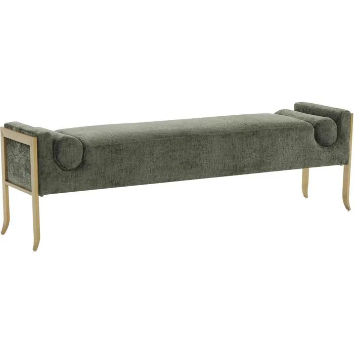 Introducing the Ines Textured Velvet Bench - a piece that exudes art deco elegance and is sure to elevate any room with its luxurious design. The deco-inspired design is evident in the bench's angular lines and attached bolster cushions, which are accentuated by the brushed brass-finished legs. Available in cream or green textured velvet.