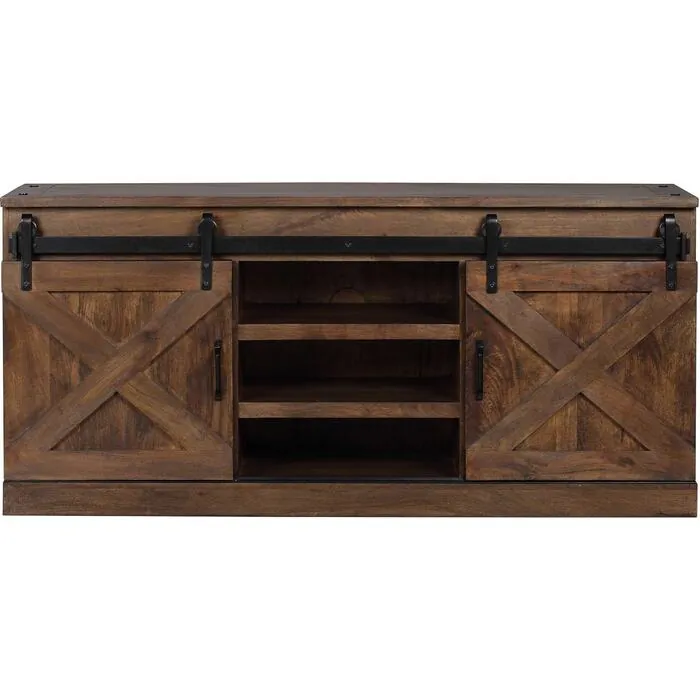 Introducing the versatile Dawson Rustic Brown Console, a stunning fusion of rustic charm and practicality. With its sliding barn doors, this console offers a unique flair that complements any space. Whether used as an entertainment console or a storage piece in a dining room or elsewhere, its spacious interior provides ample room for your belongings. Experience the perfect harmony of rustic allure and contemporary design with the Dawson Rustic Brown Console.