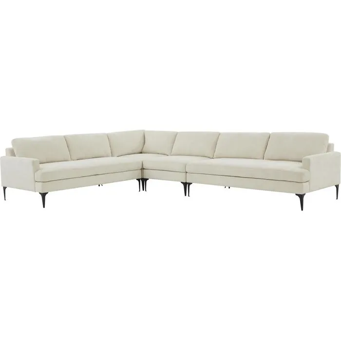The Serena Collection makes modern design soft and cozy and is sure to become your favorite spot. This 4-piece sectionalâ€â€Âleft-arm loveseat, right-arm loveseat, armless chair, and corner chairâ€â€Âis upholstered in a luxurious cream distressed velvet for lots of texture, and is available in three colors. The clean lines are complemented by tall matte black metal legs. Enjoy our preset configurations or customize your own design - the Serena is the sectional you have been looking for.