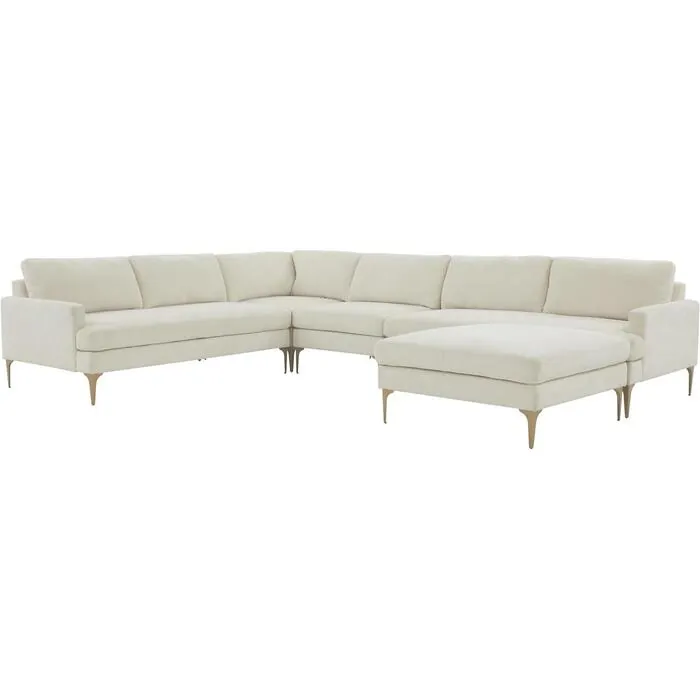 The Serena Collection makes modern design soft and cozy and is sure to become your favorite spot. This 5-piece sectionalâ€â€Âleft-arm loveseat, right-arm loveseat, armless chair, corner chair, and ottomanâ€â€Âis upholstered in a luxurious cream distressed velvet for lots of texture, and is available in three colors. The clean lines are complemented by tall metal legs finished in brass. Enjoy our preset configurations or customize your own design - the Serena is the sectional you have been looking for.