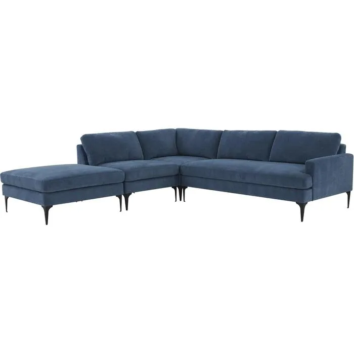 The Serena Collection makes modern design soft and cozy and is sure to become your favorite spot. This 4-piece sectionalâ€â€Âright-arm loveseat, corner chair, armless chair, and ottomanâ€â€Âis upholstered in a luxurious blue distressed velvet for lots of texture, and is available in three colors. The clean lines are complemented by tall matte black metal legs. Enjoy our preset configurations or customize your own design - the Serena is the sectional you have been looking for.