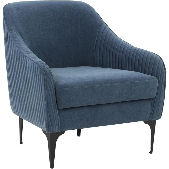 The Serena Accent Chair makes modern design soft and cozy and is sure to become your favorite spot. Available in three colors, this accent chair features a stylish pleated back and is upholstered in a luxurious blue distressed velvet for lots of texture. The clean lines are complemented by tall matte black metal legs. Look no further than the Serena Accent Chair for the perfect addition to your home.