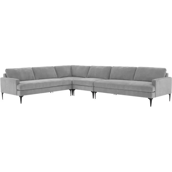 The Serena Collection makes modern design soft and cozy and is sure to become your favorite spot. This 4-piece sectionalâ€â€Âleft-arm loveseat, right-arm loveseat, armless chair, and corner chairâ€â€Âis upholstered in a luxurious gray distressed velvet for lots of texture, and is available in three colors. The clean lines are complemented by tall matte black metal legs. Enjoy our preset configurations or customize your own design - the Serena is the sectional you have been looking for.