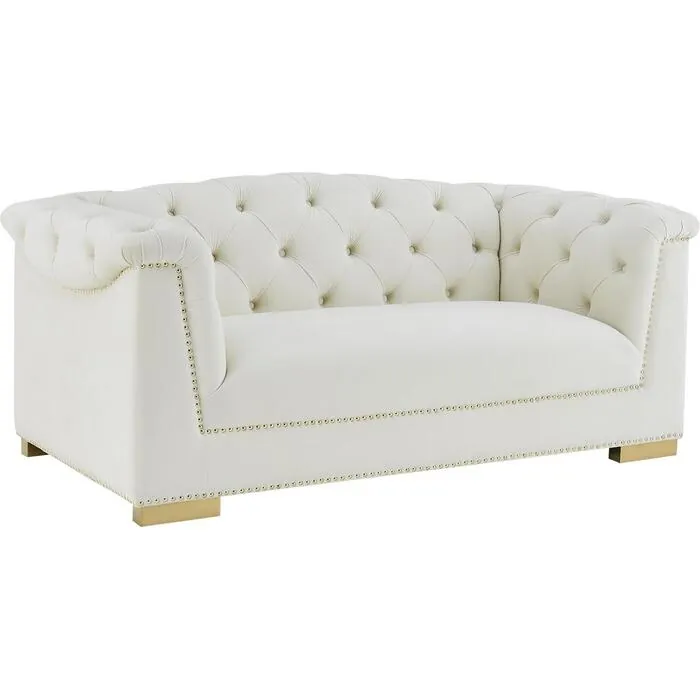Offering a fresh and modern spin to a classic style, Inspire Me Home Decor and TOV proudly introduce the Farah loveseat. With its luscious velvet upholstery, unique tufted design on its rolled arms and hand applied gold nailhead trim, it will be the focal point of your living space. Available in several neutral color options to meet your home styling needs.