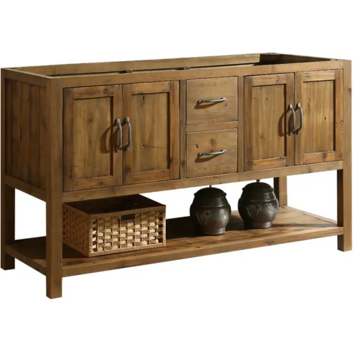 The Austin bathroom vanity cabinet by Design Element combines classic rustic charms with modern features. The cabinet is made from 100% reclaimed wood which is both durable and environmentally friendly. Each Austin vanity has its own unique history. The soft closed doors and drawers bring modern features to the vanity, while the included antique pewter metal hardware provides the perfect finishing touch. Vanity top, sink, faucet and drain are not included. *Due to the nature of reclaimed wood, each vanity may have distinct markings, knots, slight cracks, and uneven surfaces. These imperfections only add to the rustic beauty and will not hinder functionality.