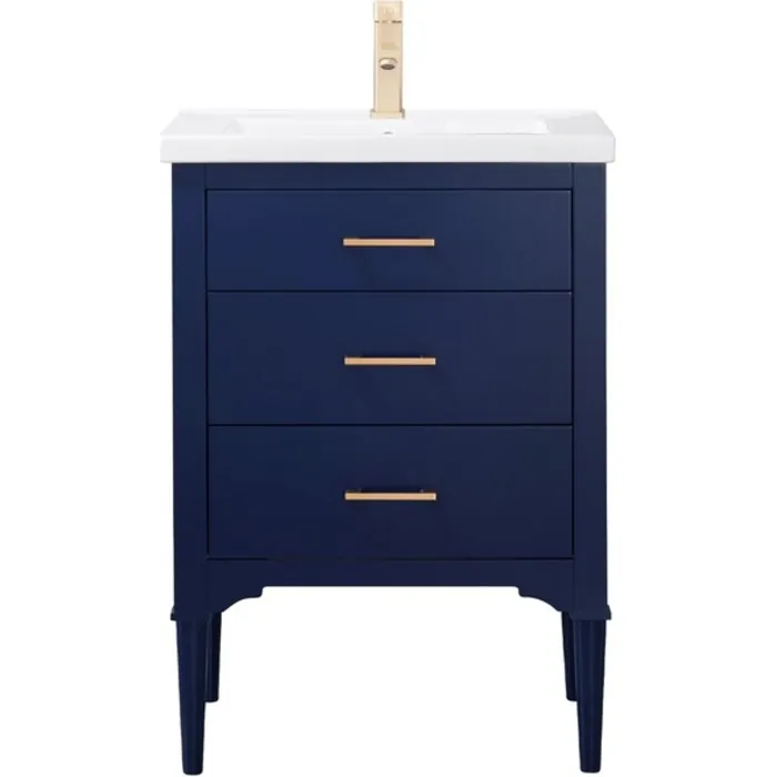 The Mason 24” Single Sink Vanity by Design Element provides the perfect finishing touch to your bathroom remodel project. Constructed of solid hardwood structure with manufactured wood panels, this vanity will maintain its beauty and functionality year after year. The porcelain countertop and integrated sink with overflow perfectly matches the styling of the cabinet, and is extremely simple to maintain. Each of the 2 fully functional drawers are constructed with dovetail joints and soft close glides. The included satin gold hardware perfectly compliments the blue cabinet. Faucet and drain are not included.