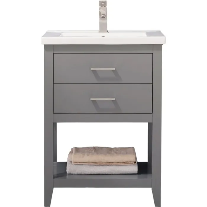 The Cara 24” Single Sink Vanity by Design Element provides the perfect finishing touch to your bathroom remodel project. Constructed of solid hardwood structure with manufactured wood panels this vanity will maintain its beauty and functionality year after year. The porcelain countertop and integrated sink with overflow perfectly matches the styling of the cabinet, and is extremely simple to maintain. There is ample storage space for this vanity despite its small size. Hidden in the flip down drawer is a unique and useful storage box, and a second fully functional drawer constructed with dovetail joinery sits on soft close glides. There is also an open shelf at the base of the cabinet. The included Satin nickel hardware provides the perfect finishing touch to the gray cabinet. Faucet and drain are not included.