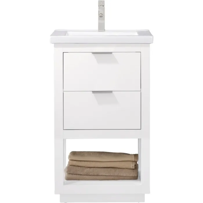 The Klein 20” Single Sink Vanity by Design Element provides the perfect finishing touch to your bathroom remodel project. Constructed of solid hardwood structure with manufactured wood panels this vanity will maintain its beauty and functionality year after year. The porcelain countertop and integrated sink with overflow perfectly matches the styling of the cabinet, and is extremely simple to maintain. There is ample storage space for this vanity despite its small size. Hidden in the flip down drawer is a unique and useful storage box, and a second fully functional drawer constructed with dovetail joinery sits on soft close glides. There is also an open shelf at the base of the cabinet. The included Satin nickel hardware provides the perfect finishing touch to the white cabinet. Faucet and drain are not included.