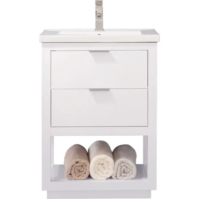 The Klein 24” Single Sink Vanity by Design Element provides the perfect finishing touch to your bathroom remodel project. Constructed of solid hardwood structure with manufactured wood panels this vanity will maintain its beauty and functionality year after year. The porcelain countertop and integrated sink with overflow perfectly matches the styling of the cabinet, and is extremely simple to maintain. There is ample storage space for this vanity despite its small size. Hidden in the flip down drawer is a unique and useful storage box, and a second fully functional drawer constructed with dovetail joinery sits on soft close glides. There is also an open shelf at the base of the cabinet. The included Satin nickel hardware provides the perfect finishing touch to the white cabinet. Faucet and drain are not included.