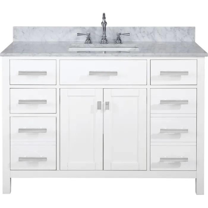 - 3/4" Thick Seamless Carrara Marble Countertop with Pre-Drilled Holes to accommodate 8" Wide Spread Faucets
