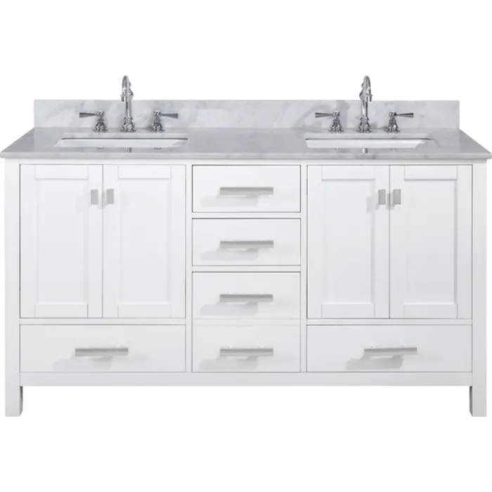 - 3/4" Thick Seamless Carrara Marble Countertop with Pre-Drilled Holes to accommodate 8" Wide Spread Faucets
