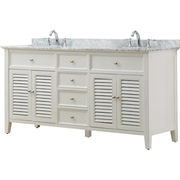 An ancient Greece inspired design finally finds its place in the modern era with this 70 in. Pearl white Shutter double bathroom vanity set. Angled louvers, are used extensively to create a casual but yet functional feel on this double vanity sink cabinet. Our exclusive Shutter double bathroom vanity set perfectly combines sleek contemporary design with optimal concealed storage space for a truly exceptional bathroom vanity design. White porcelain sinks blend into the prized Carrara marble countertop specifically selected for this contemporary Shutter bathroom vanity console. 4 functional drawers are built with dove-tailed drawer joinery, finger-joint panel flanked by 2 double-door cabinets with adjustable shelves. All cabinet frames, door frames and legs are constructed of solid birch wood.(1)Finger joined panels; dove tailed joined solid wood drawer boxes on soft closing mechanism (2)Concealed, tri-axial adjustable soft closing door hinges (3)Vanity in pearl white; top is carrara marble top (4)Hardware is in satin nickel finish (5)2 sets of doors, each with 1 adjustable shelf; 4 drawers (6)Faucets, towels, baskets, mirrors and back splash shown are not included (7)Set includes vanity cabinet, top and porcelain sinks (8)Cabinet treated for humidity resistance; top pre-sealed against water but needs to be sealed again for regular use during installation (9)Hand crafted furniture; handmade characters exist (10)For rough in, 40 in. drain to drain (11)Eco-conscience vendor; we sponsor National Forest Foundation to offset the wood used for making your furniture (12)Each customer can purchase up to 2 sets at 1 time (13)Back splash is not included.