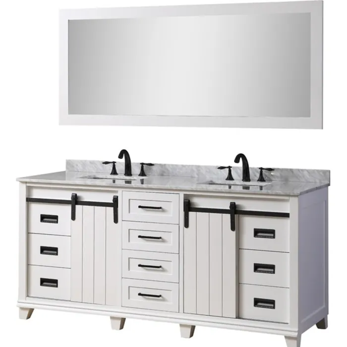 The Chanceton 71" double bathroom vanity sink is a unique blending of modern style with rustic design elements. The smooth, modern lines and white cabinet finish is paired with an elegant White Carrara Marble top and black hardware. Will sure have your family and guests admiring the look of your bathroom. The sliding, barn-style cabinet doors give this vanity a truly unique touch with pull out drawers providing ample storage for all your essentials. Constructed of solid birch, this piece’s style is only matched by its dependability. The Chanceton vanity is the perfect set for finishing off your bathroom remodel.