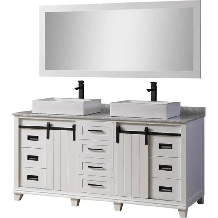 The Chanceton 72" double bathroom vanity sink is a unique blending of modern style with rustic design elements. The smooth, modern lines and white cabinet finish is paired with an elegant White Carrara Marble top and black hardware. Will sure have your family and guests admiring the look of your bathroom. The sliding, barn-style cabinet doors give this vanity a truly unique touch with pull out drawers providing ample storage for all your essentials. Constructed of solid birch, this piece’s style is only matched by its dependability. The Chanceton vanity is the perfect set for finishing off your bathroom remodel.