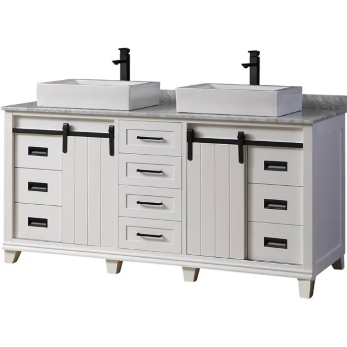 The Chanceton 72" Bath and Makeup Hybrid Vanity sink is a unique concept combining the make up vanity with the double vanity sink cabinets; blending of modern style with rustic design elements. The smooth, modern lines and white cabinet finish is paired with an elegant White Carrara Marble top and black hardware. Will sure have your family and guests admiring the look of your bathroom. The sliding, barn-style cabinet doors give this vanity a truly unique touch with pull out drawers providing ample storage for all your essentials. Constructed of solid birch, this piece’s style is only matched by its dependability. Completed with features like integrated power outlet for the hair dryer, iron, and phone charging capability and an jewelry organizer. The Chanceton vanity is the perfect set for finishing off your bathroom remodel.