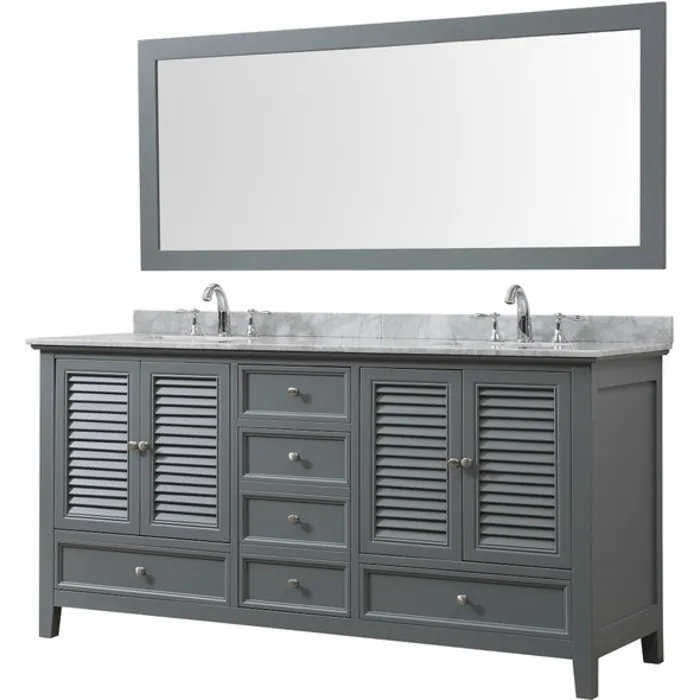 72" Shutter Bath and Makeup Hybrid Vanity is a unique concept combining the make up vanity with the double vanity sink cabinets. White porcelain sinks blend into the prized Carrara marble countertop specifically selected for this contemporary Shutter bathroom vanity console.The vanity cabinet features 5 side opening doors , 2 full size drawers, and 1 make up organizer drawer to provide a layout that is timeless and Shutter. The make up vanity comes with a stow away stool (US Utility Patent Pending) and makeup organizer drawer allowing for a seemless connection between the bath and makeup vanities.(1)Makeup vanity in center console with stow away seat feature. Make up organizer drawer. (US Patent Pending)(2)Finger joined panels; dove tailed joined solid wood drawer boxes on soft closing mechanism(3)Vanity in gray; top is carrara white marble (4)Hardware in satin nickel finish(5)5 Doors, 2 oversize drawers, 1 make up organizer drawer(6)Faucets, towels, and baskets shown are not included (7)Set includes bath and makeup hybrid vanity cabinet, makeup vanity, top, seat, and porcelain sinks 1 matching mirror(8)Matching back splash will be provided only as a free courtesy, we do not warrant the back splash for matching characters nor breakage(9)For rough in, 40.5 in. drain to drain, 24 in. - 26 in. above the floor (10)Hand crafted furniture; handmade characters exist (11)Each customer can purchase up to 2 sets at 1 time (12)Eco-conscience vendor; we plant a tree for every vanity sold to Earth Day Network Canopy Project to offset the wood used for making your furniture(13)Top pre-sealed against water but needs to be sealed again for regular use during installation(14)Cabinet treated for humidity resistance; but not designed to be in the same room with steam shower