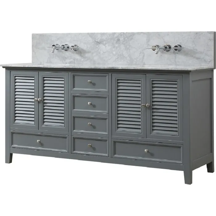 An ancient Greece inspired design finally finds its place in the modern era with this 72 in. gray Shutter Premium bathroom vanity set. Angled louvers, are used extensively to create a casual but yet functional feel on this double vanity sink cabinet. Our exclusive Shutter Premium double sink bathroom vanity set perfectly combines sleek contemporary design with optimal concealed storage space for a truly exceptional bathroom vanity design. White porcelain sink contrasting with the carrara white marble countertop specifically selected for this contemporary Shutter Premium bathroom vanity console. All cabinet frames, door frames and legs are constructed of solid birch wood. To top it off, we make it wall mount faucets ready; we make the installation of wall mount faucet all within the cabinet so you do not need to mess with the wall (US utility patent ). You will be able to enjoy a designer level bathroom with wall mount faucet on a furniture style vanity. This double vanity includes the cabinet, the marble top and under-mount white porcelain sinks.(1)Wall-mount faucet ready vanity, retrofittable with Kohler faucets (Kohler rough In valve K-410-K-NA required) (US utility patent)(2)Finger joined panels; dove tailed joined solid wood drawer boxes on soft closing mechanism(3)Concealed, tri-axial adjustable soft closing door hinges (4)Vanity is in Gery; top is Carrara White Marble top (5)Hardware is in satin nickel finish (6)5 Doors, 6 Drawers(7)Faucets,baskets,towels and mirror shown are not included(8)Set includes vanity cabinet, top, and porcelain sink (9)For rough in, 40.5 in. drain to drain, 24 in. - 26 in. above the floor (10)Eco-conscience vendor; we plant a tree for every vanity sold to Earth Day Network Canopy Project to offset the wood used for making your furniture(11)Each customer can purchase up to 2 sets at 1 time (12)Top pre-sealed against water but needs to be sealed again for regular use during installation (13)Cabinet treated for humidity resistance; but not designed to be in the same room with steam shower(14)Hand crafted furniture; handmade characters exist