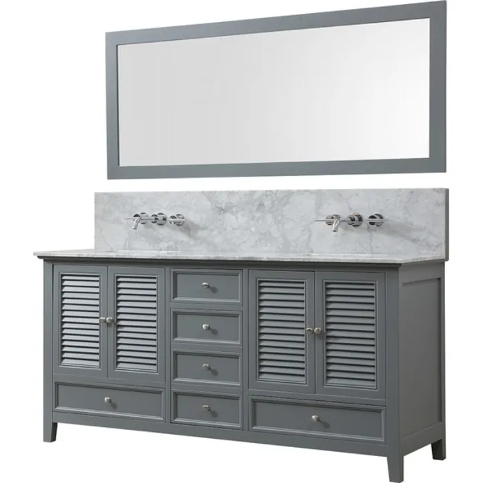 Direct Vanity Shutter Premium 72 In. Bathroom Vanity In gray With Carrara White Marble Bathroom Vanity Top with white basins and Mirror 72D12-GWC-WM-M