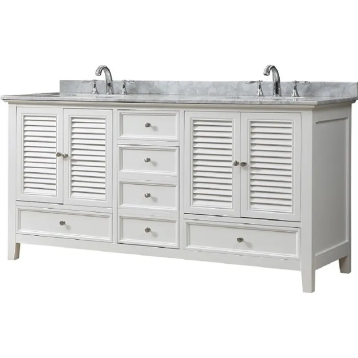 72" Shutter Bath and Makeup Hybrid Vanity is a unique concept combining the make up vanity with the double vanity sink cabinets. White porcelain sinks blend into the prized Carrara marble countertop specifically selected for this contemporary Shutter bathroom vanity console.The vanity cabinet features 5 side opening doors , 2 full size drawers, and 1 make up organizer drawer to provide a layout that is timeless and Shutter. The make up vanity comes with a stow away stool (US Utility Patent Pending) and makeup organizer drawer allowing for a seemless connection between the bath and makeup vanities.(1)Makeup vanity in center console with stow away seat feature. Make up organizer drawer. (US Patent Pending)(2)Finger joined panels; dove tailed joined solid wood drawer boxes on soft closing mechanism(3)Vanity in white; top is carrara white marble (4)Hardware in satin nickel finish(5)5 Doors, 2 oversize drawers, 1 make up organizer drawer(6)Faucets, towels, baskets and mirror shown are not included (7)Set includes bath and makeup hybrid vanity cabinet, makeup vanity, top, seat, and porcelain sinks (8)Matching back splash will be provided only as a free courtesy, we do not warrant the back splash for matching characters nor breakage(9)For rough in, 40.5 in. drain to drain, 24 in. - 26 in. above the floor (10)Hand crafted furniture; handmade characters exist (11)Each customer can purchase up to 2 sets at 1 time (12)Eco-conscience vendor; we plant a tree for every vanity sold to Earth Day Network Canopy Project to offset the wood used for making your furniture(13)Top pre-sealed against water but needs to be sealed again for regular use during installation(14)Cabinet treated for humidity resistance; but not designed to be in the same room with steam shower.
