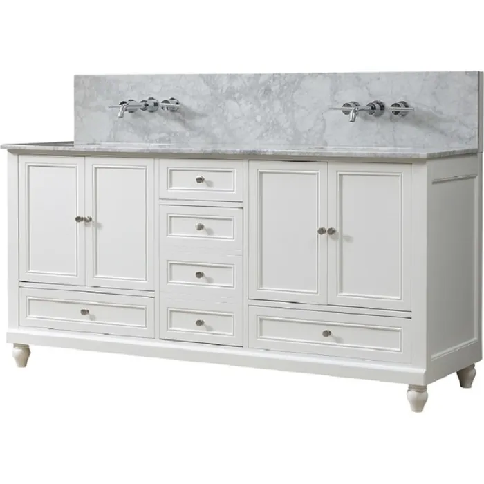 Our 72 in. Classic Premium Double Bathroom Vanity Sink Cabinet is the perfect complement for any traditional-style home and bathroom. Our exclusive White double vanity cabinet is raised slightly off of the floor by beautifully carved classic turned-feet to provide expansive, yet concealed storage space. The design of this classic style bathroom vanity set is carried through the entire vanity sink cabinet in the rich paneled doors with satin nickel hardware. The prized Carrara marble countertop was specifically selected for this classic double sink bathroom vanity. Under-mount rectangular white porcelain vanity sinks blend silently into the classical design. It comes with 6 functional drawers built with dove-tailed drawer joinery and finger-joined panel. Extensive storage space is included on either side by double-door cabinets with divided compartments.. To top it off, we make it wall mount faucets ready. Retrofittable with Kohler faucets (Kohler rough In valve K-410-K-NA required) (US utility patent) We make the installation of wall mount faucet all within the cabinet so you do not need to mess with the wall (US utility patent ). You will be able to enjoy a designer level bathroom with wall mount faucet on a furniture style vanity.(1)Wall-mount faucet ready vanity, retrofittable with Kohler faucets (Kohler rough In valve K-410-K-NA required) (US utility patent)(2)Finger joined panels; dove tailed joined solid wood drawer boxes on soft closing mechanism(3)Concealed, tri-axial adjustable soft closing door hinges(4)Vanity is in White ; top is carrara white marble (5)Hardware is in satin nickel finish(6)5 Doors; 6 Drawers(7)Faucets, towels, baskets,and mirror shown are not included(8)Set includes vanity cabinet, top and porcelain sinks (9)Hand crafted furniture; handmade characters exist (10)For rough in, 40.5 in. drain to drain, 24 in. - 26 in. above the floor (11)Eco-conscience vendor; we plant a tree for every vanity sold to Earth Day Network Canopy Project to offset the wood used for making your furniture(12)Each customer can purchase up to 2 sets at 1 time (13)Top pre-sealed against water but needs to be sealed again for regular use during installation(14)Cabinet treated for humidity resistance; but not designed to be in the same room with steam shower