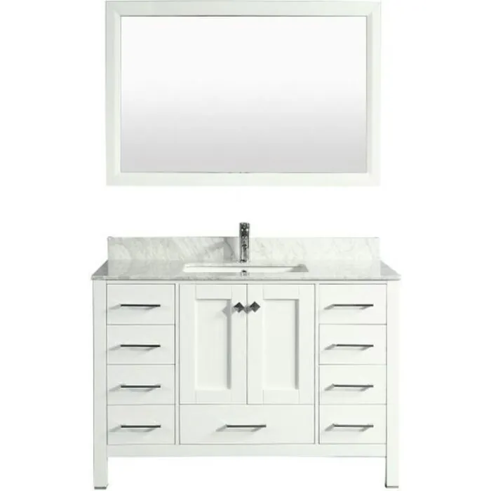 Eviva Aberdeen 42" white bathroom vanity has unique and very simple lines that define its simplicity. Eviva Aberdeen comes with a double layer Italian white Carrera marble counter-top with beautiful natural grey lines. If you are looking for an elegant transitional vanity with great storage, Eviva Aberdeen should be on the top of your list. Price Includes: Bathroom Cabinet, Counter-top, Sink -Brushed Nickel Hardware.