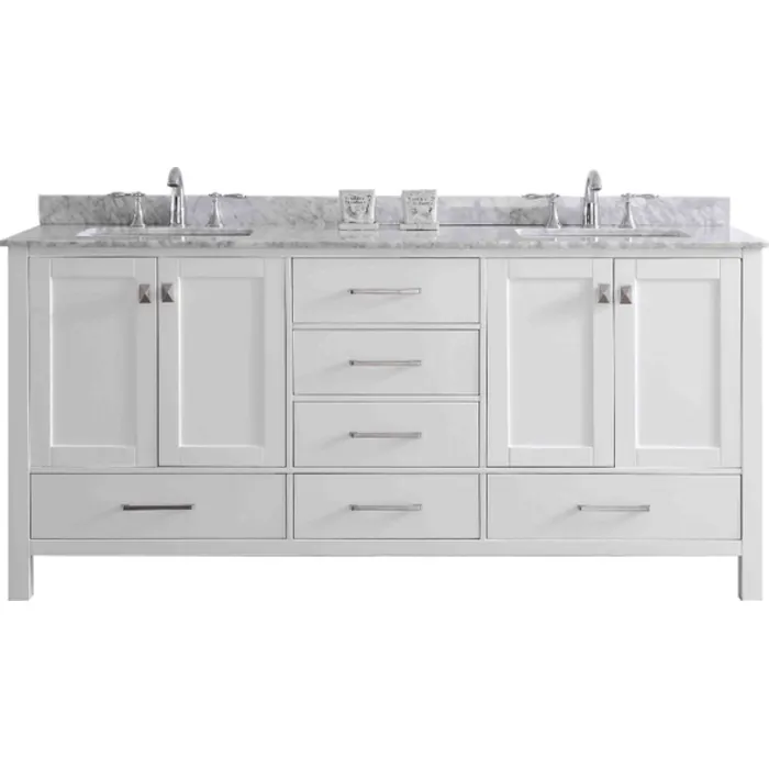 With so much room for innovation, the Eviva Aberdeen keeps breaking established rules with the all new size 78 in. Eviva Aberdeen comes with a double layer Italian white Carrera marble counter-top with beautiful natural grey lines. If you are looking for an elegant transitional vanity with great storage, Eviva Aberdeen should be on the top of your list. Price Includes: Bathroom Cabinet, Counter-top, Sink -Brushed Nickel Hardware.