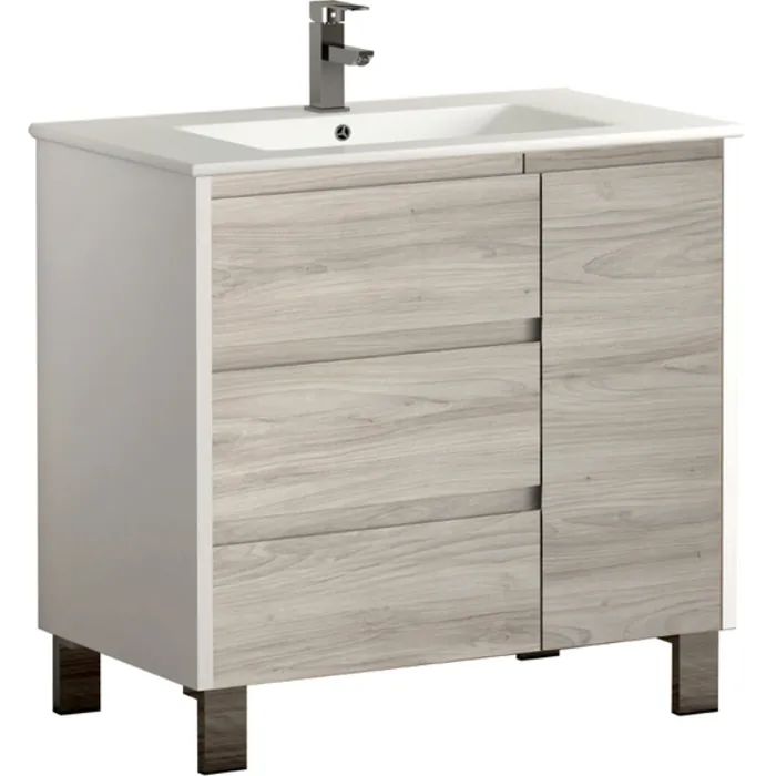 Eviva Bella is the newest addition from Spain that offers outstanding features and looks. Its modern design, enormous capacity with 2 doors and 3 drawers all soft closing and fully extending, great variety of colors, and sleek white porcelain non-porous sink will dwarf all of its competitors and leaves you with a a vanity that is worthy of its name. Eviva Bella will have its marks on your bathroom. Eviva Bella comes in two sizes, 32"es and 39"es. Also available in two color combinations (white/oak, white/gray pine).