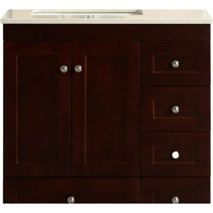 The Acclaim Caroline 30" single under-mount sink vanity is constructed of solid wood with a durable water resistant polyurethane finish outside and water resistant layer inside. The Acclaim Caroline vanity comes with a white Carrera marble top that provides the bathroom with a contemporary/transitional look. Price Includes: Bathroom Cabinet, Counter-top, Sink, Hardware.
