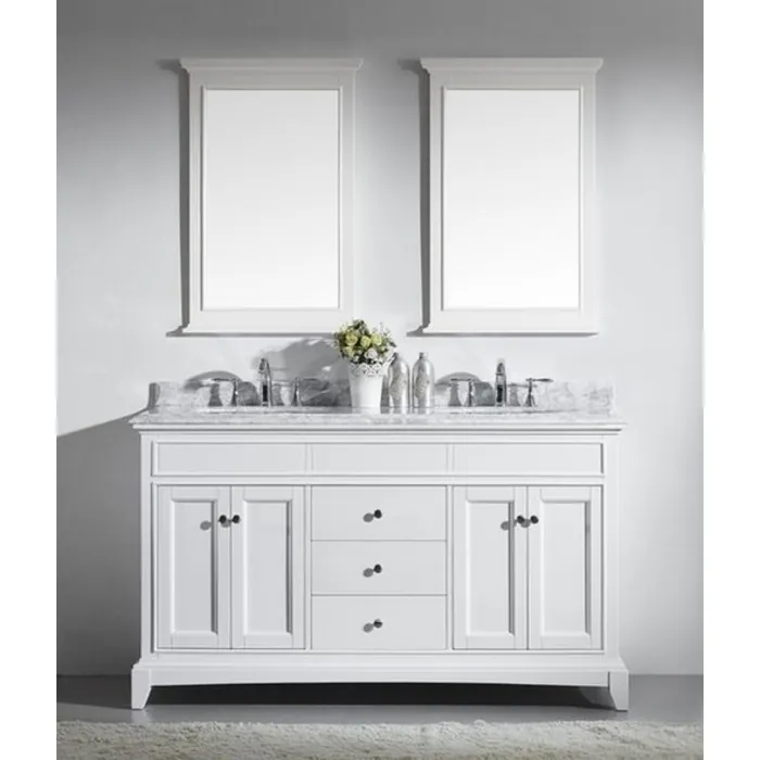 Eviva Elite Stamford 60 inch White Solid Wood Bathroom Vanity Set With Double Og White Carrera Marble Top White Undermount Porcelain Sinks EVVN709-60WH