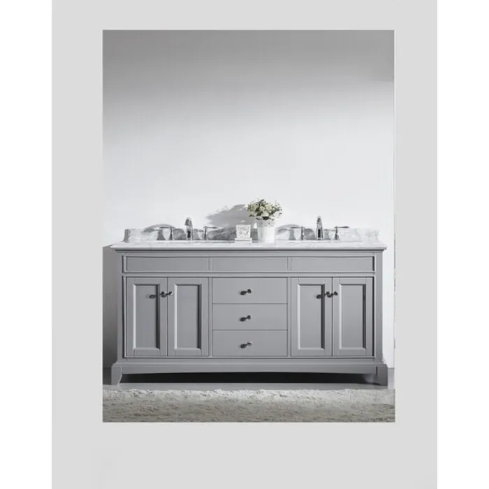 bathroom furniture designed (designs) additionally with a Double OG White Italian Carrera Marble counter-top provides the and accents the bathroom cabinet with a very luxury look. The 72" Stamford bathroom vanity is designed and fully constructed of solid wood (Base & Doors). Soft closing hinges are also another feature of the stamford bathroom vanities. A perfect wide undermount porcelain sinks integrated within the counter-top piece that minimizes any kind of water oversplashing. The 72" chilled grey finish makes the stamford a peice of furniture.