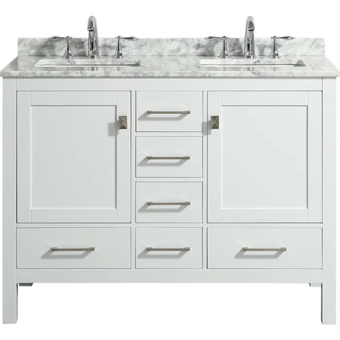 The 18"es deep Eviav London enjoyed a huge success since its inception, now Eviva has doubled down (literally) with double sinks on a 48"es wide vanity! The Eviva London is truly one of a kind vanity, with a depth of 18" it offers a lot in compact size. This vanity features peerless modern lines, enormous storage and white Carrara marble top with rectangle sink and pre-drilled single hole. The elegance of the Eviva London with all its features and unique depth makes it incomparable to anything in the market which will leave an overarching artistic look making your bathroom second to none.