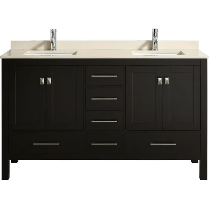 Eviva London 60 inch X 18 inch Transitional Espresso Bathroom Vanity With Crema Marfil Marble And Double Porcelain Sinks TVN414-60X18ES