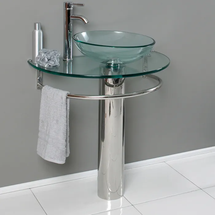 This modern glass pedestal sink is simple yet stunning. It features a gently sloped, glass vessel basin and a lovely tempered glass demi circle counter top with a single hole faucet mount. The sleek chrome stand is designed to be as practical as it is stylish—it offers the perfect spot for a hand towel. This elegant pedestal vanity measures 29” in width and would blend beautifully into any bathroom.