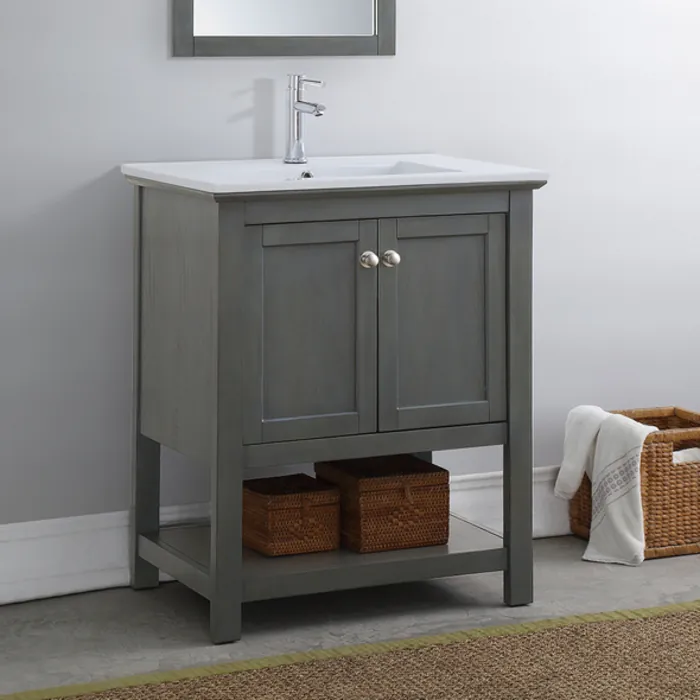 Brighten your bathroom or powder room with the clean, timeless design of our Fresca Manchester Regal 30” Traditional Bathroom Vanity. This beautifully constructed vanity features panelled solid wood doors with innovative soft close hinges to ensure they close silently and effortlessly every time. Designed to complement any décor scheme, this traditional vanity features a natural, Gray Wood Veneer finish and brushed nickel handles. An open bottom shelf is ideal for storing towels and additional bath supplies. A lovely integrated white ceramic sink with rounded basin adds to the vanity’s clean aesthetic. It is equipped with an integrated overflow and single hole faucet mount. This stylish vanity is offered in a choice of several finishes. It includes installation hardware and is also available in a 24” size. The matching Fresca Manchester Regal Gray Wood Veneer Traditional Bathroom Mirror (sold separately) completes the look.