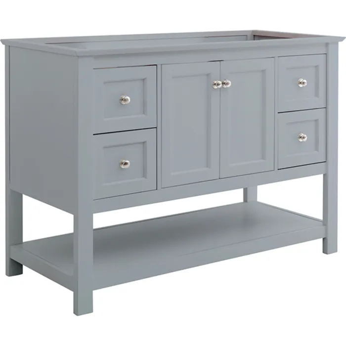 Add instant style and classic charm to your bathroom with the clean, timeless design of our Fresca Manchester 48” Traditional Bathroom Cabinet. This beautifully constructed cabinet features panelled solid wood doors with soft close hinges to ensure they close silently and effortlessly every time. There are four soft closing drawers that offer ample space for your bathroom essentials and an open bottom shelf for storing towels and additional bath supplies. This traditional cabinet has an elegant, painted Gray finish and brushed nickel handles. It includes installation hardware and is available in several sizes and finishes to meet your decorating needs.